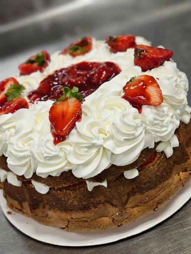 Classic Buttah Pound Cake filled with sliced strawberries, fresh strawberry glaze and whipped cream all made in house.